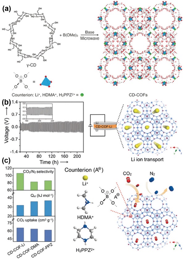 (b)Li离子在含有Li+的CD-COF通道中传输的原理图;