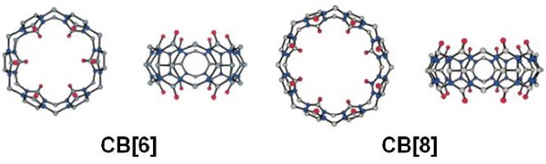 图二十四、CB[6]和CB[8]的结构。颜色代码:碳,灰色;氮,蓝色;氧气,红色。