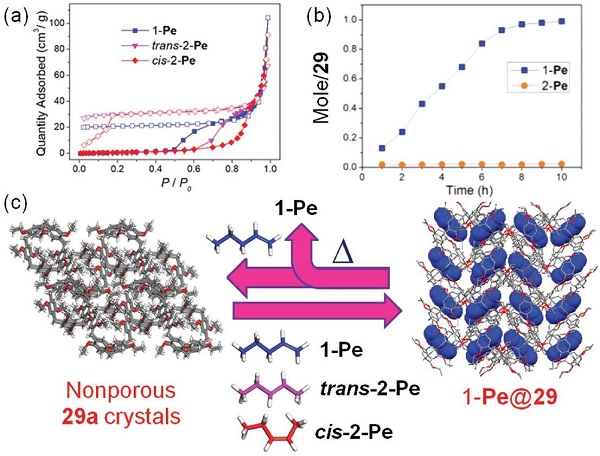 (a)29a晶体对具有开门行为的线性烷烃和支链烷烃的吸附示意图;