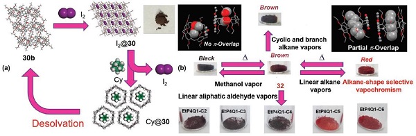 (b)32(顶)烷烃型选择性汽色行为的示意图表征。在单晶的X射线结构中,C=灰色,O=红色,H原子为清晰省略。照片显示,当20毫克的32晶体暴露在不同的脂肪醛中12 h(底部)时,颜色会发生变化。