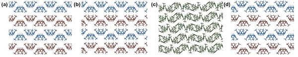 (b)16型Ⅰ型二聚体与交替二聚体(顶)之间的溶剂(三个甲醇分子)包涵体的交叉正面和反面的填料图;