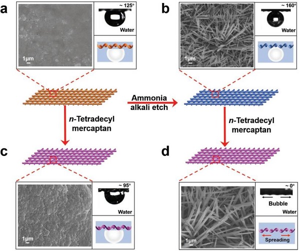 (d)正十四烷基硫醇改性的氨碱性腐蚀后网格的SEM图和水下气泡的接触角照片。