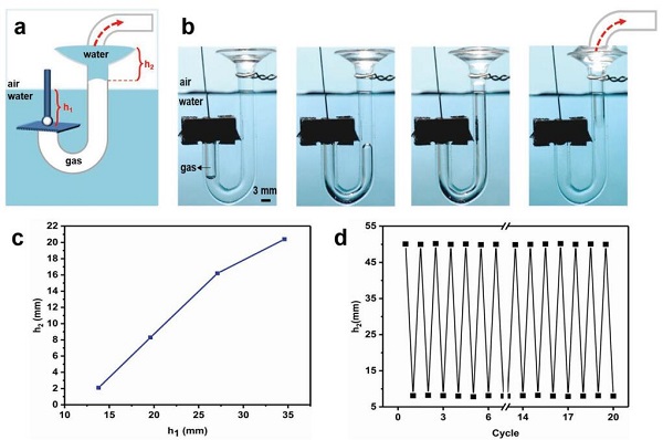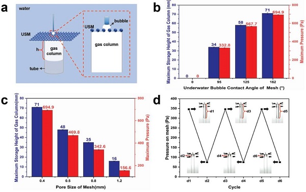 基于上述问题,北京航空航天大学的刘克松教授(通讯作者)、Dongliang Tian(通讯作者)和江雷院士等人受到水蜘蛛气体存储机制的启发,通过设计一个由石英管组成的单层水下超好氧滤网(USM),展示了一种连续收集和运输水下气泡的策略。其中,注射泵提供的气泡首先穿过网孔,然后聚集在石英管中形成气柱。当气柱达到最大存储高度/压力时,就会发生塌陷。在连续不断的供应气泡下,压力的变化就成为一个循环过程,其作用类似于泵,在装有不对称U形管的USM设备中将气泡连续的从水相输送到气相中。这种新颖的气体收集和运输系统为开发用于管道、传感器、气体收集和环境保护的新技术提供了新思路。该研究成果以题为“An Innovative Design by Single-Layer Superaerophobic Mesh: Continuous Underwater Bubble Antibuoyancy Collection and Transportation”发布在国际著名期刊Adv. Funct. Mater.上。