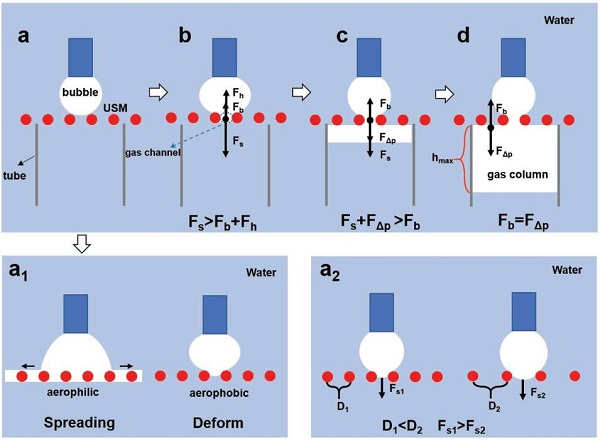 众所周知,在水性介质中,气泡是几乎无处不在的且无法避免,对于工业生产和日常生活具有各种积极的和消极的影响。其中,水下气泡在催化反应、环境修复和生物医学等领域具有广阔的应用前景。然而,水下气泡也可能会导致严重的有害影响。例如,甲烷(CH4)在水生系统(海洋、湖泊等)中扩散到大气中的潜力是二氧化碳的25倍,既对全球变暖造成了影响,又浪费了本可以用作燃料和工业产品原料的资源。因此,对水下气泡进行控制,从而实现气体的收集和输送具有重要意义。