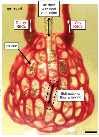 实体器官由于复杂的血管网络发生互相纠缠,形成了复杂的三维传输方式,使得科学家对其研究非常困难。来自美国莱斯大学和华盛顿大学的研究团队主导了一项具有里程碑意义的研究,即利用3D打印技术制造肺气囊模型。该模型具有与人体血管和气管结构相同的网络结构,并能够像肺部一样朝周围的血管输送氧气,完成“呼吸”过程,其成果于五月发表于Science杂志封面。