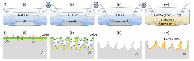 科学家们试着将碳纳米管结构整合到基底表面,使得材料得以获得功能性上的提升。然而,金属基底上的氧化物钝化层常常表现出的电子和声子传输阻碍作用,大大限制了碳纳米管的运用。常规碳纳米管的整合思路包括转移/粘合和直接合成法。然而,上述方法或会造成基底表面的缺陷,降低材料的物理和化学性能,或因为需要较高的加工温度和条件,导致过程过于复杂和高昂的成本。来自上海交通大学的崔可航教授研究组提出了一种适用于铝基底的可扩展的表面活化技术可实现钝化膜的分解和碳纳米管在金属表面的直接合成。过程中,表面活化过程起到了去除氧化层和产生纳米结构表面使催化剂负载量增高的作用。试验结果显示,碳纳米管和金属基底的结构促进了介电自由能载流子传输路径并阻止了氧化钝化层的重整。相较于没有表面活化的金属基底,该材料的界面电阻仅为前者的1/5。该技术可用于制造纳米结构表面并进而用于各种催化应用。值得一提的是,该研究组整合碳纳米管得到的材料从各个角度吸收的入射光都大于99.995%,尽管他们最初的目的并非制造一种极黑的材料。