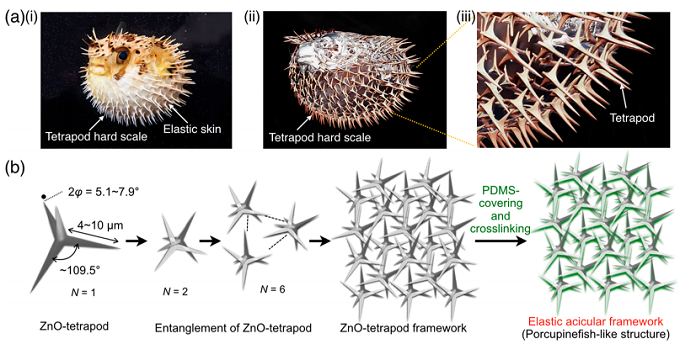 具有纳米纹理表面的超疏水材料具有自清洁,防污,防冰,防腐蚀等运用。但是,同样是受限于其结构,这种材料容易碎且易变和损坏。日本国家实验室的Yoshihiro受到鲀鱼的启发,使用微米级的四脚形ZnO和聚二甲基硅氧烷开发了具有鲀鱼状结构的柔性材料,并检测了其关于磨损,刮擦,切片,弯曲和耐扭曲等形变状况下的耐久性。试验结果显示,该材料在1000次磨损和1000次弯曲循环后依旧表现出稳定的疏水性。材料即使在弯曲和扭曲状态下,也具有超疏水性。 这一研究成果有利于该材料被广泛运用到各种应用中。