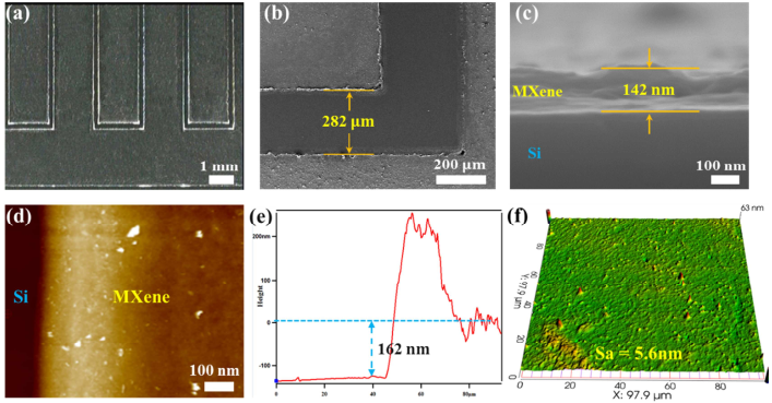 (d) 芯片式MSCs的拉贡(Ragone)图谱,通过与rGO-CNT、VN/CNT、PPy、LSG等进行比较,可以看到MXene基芯片式MSCs同时具有较高的能量密度和功率密度,展现出良好的电化学存储能力;