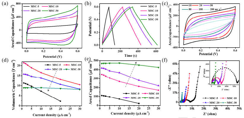 图3. 芯片式微型超级电容器MSC-5到MSC-30的电化学性能