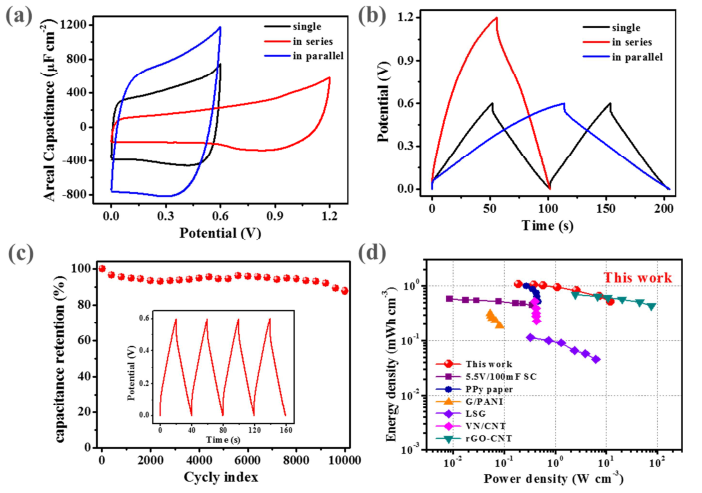 (a) 单个器件、串联、并联的器件在10 mV s-1的CV曲线;