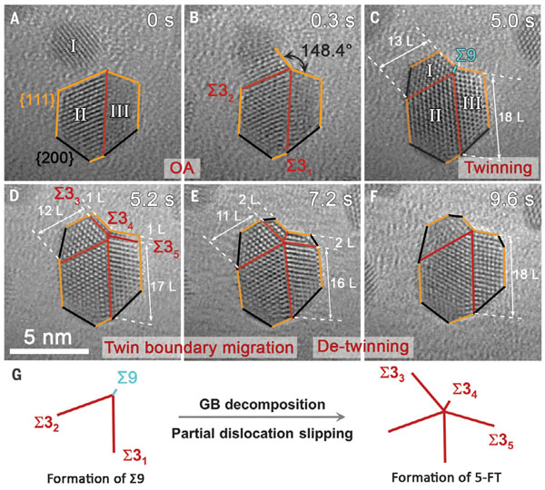 文献链接:Oriented attachment induces fivefold twins by forming and decomposing high-energy grain boundaries(Science,2019,DOI:10.1126/science.aax6511)