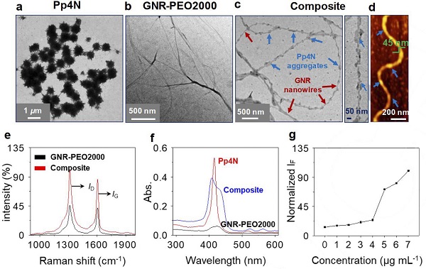 (a-c)Pp4N(5 μM)、GNR-PEO2000(2.5 μg mL-1)和复合材料的TEM图像。