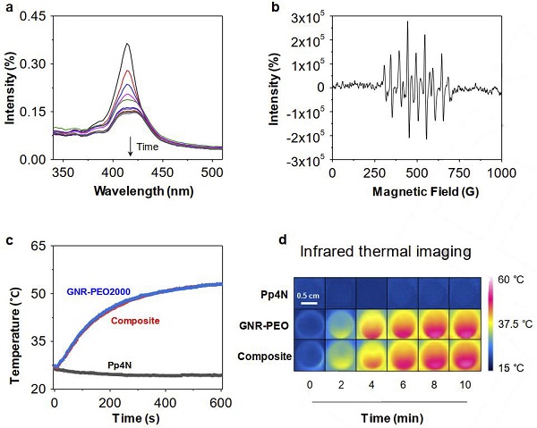 (c-d)Pp4N(5 μM)、GNR-PEO2000(2.5 μg mL-1)和复合材料的光热性质以及红外热成像图像。