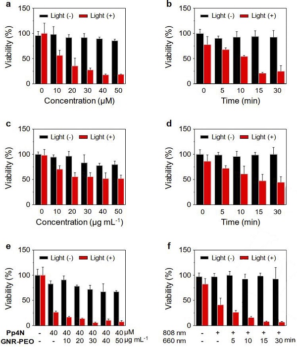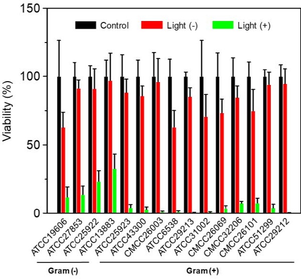 与复合材料(Pp4N / GNR = 40 µM / 30 µg mL-1)共孵育,在有无15分钟的808 nm光照下,再经过15分钟的660 nm光辐照后处理的不同细菌的存活率。