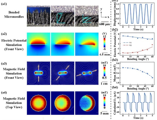 (a1)压缩过程中弯曲至不同角度的微针;(a2)COMSOL分析了TEG的电势分布;(a3-a4)COMSOL分析了EMG的磁场分布(正视图和俯视图);(b1)在复合发电机上施加外力时电极位移变化;(b2)仿真结算的TEG在两个电极上的电势;(b3)COMSOL仿真计算的穿过铜线圈的平均磁通密度;(b4)COMSOL仿真计算EMG部分的短路电流Isc。