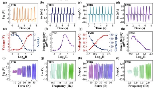 (a,b)TEG的Voc和Isc;(c,d)EMG的Voc和Isc;(e-h)输出电压、电流和功率密度随负载电阻的变化;(i-l)外力幅值和频率对TEG的Voc(i,j)和EMG的Isc(k,l)的影响。