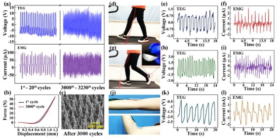 (a)TEHG在3000次压缩-释放循环中的电输出性能和(b)机械性能;(c)经过3000次压缩-释放操作后的微针阵列的扫描电镜图像;(d)将TEHG集成到鞋内进行走路试验;(e-f) 步行试验中记录的TEG的Voc和EMG的Isc;(g)将TEHG集成到鞋内进行跑步试验;(h)试验中记录的TEG的Voc和EMG的Isc;(j)将TEHG固定在手臂内侧上;(k-l)手臂运动时记录的TEG的Voc和EMG的Isc。