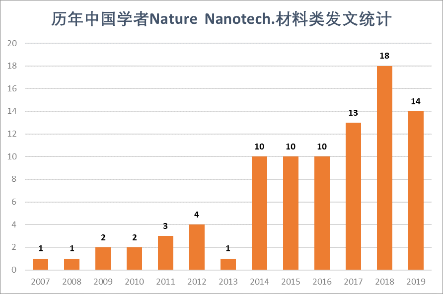 2019年我国在Nature Nanotechnology上以通讯作者或参与发表14篇材料类论文,其中中科院系统发表3篇,清华大学发表 3篇,北京航空航天大学发表2篇。