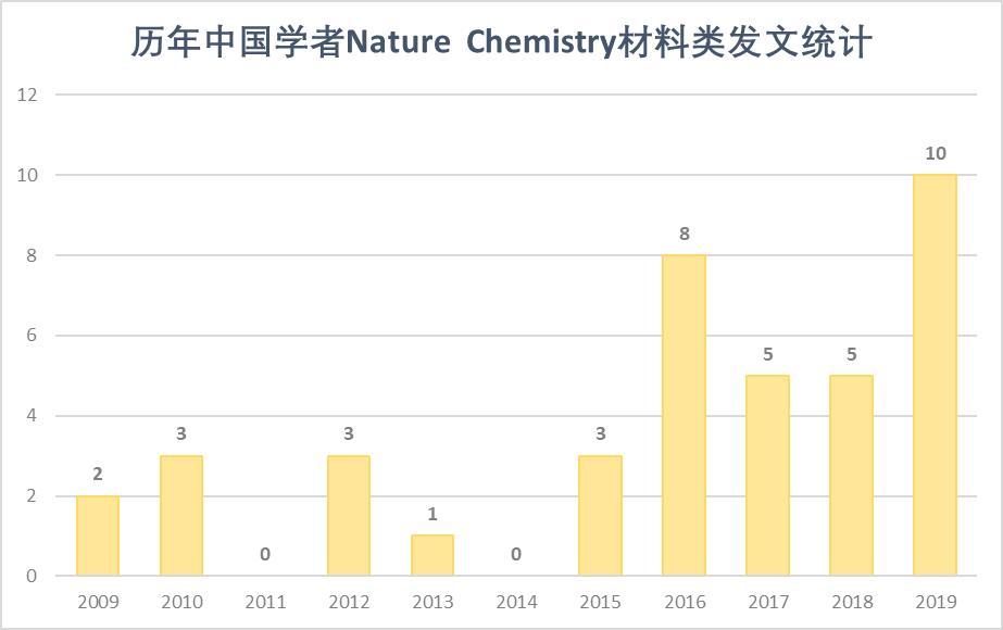 2019年我国在Nature Chemistry上以通讯作者或参与发表10篇材料类论文。其中中科院系统发表2篇,南开大学发表2篇,上海理工大学发表2篇。