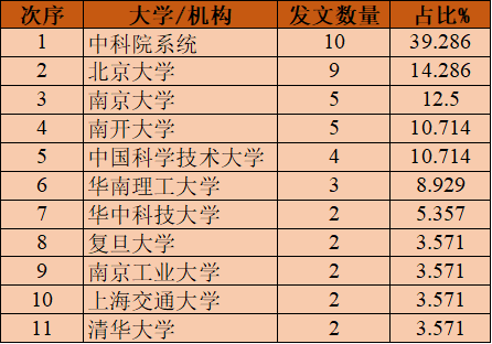 2019年我国在Nature上以通讯或参与发表31篇材料类论文,可喜可贺。其中中科院系统发文量最大14篇,传统老牌材料类强校清华大学、北京大学、中科大、浙江大学、南京大学等纷纷上榜。