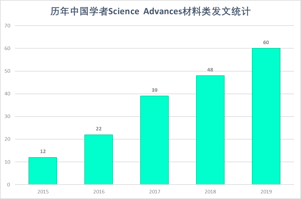 2019年我国在Science Advances上以通讯作者或参与发表60篇材料类论文,中科院系统的发文量依旧保持第一,共发表25篇;南京大学、北京大学各入6篇排在各大高校前列。