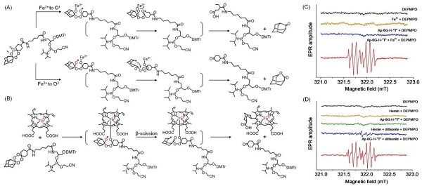 (A-B)游离Fe2+或血红素(Fe2+)介导的前药碱基“T”的激活机制;
