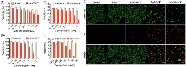 (C)钙黄绿素-AM和碘化丙啶(PI)双染色方法分析Ap-6G-“T”,Ap-6G-H-“T”或相应的非靶向胶束处理的HepG2细胞的活性;