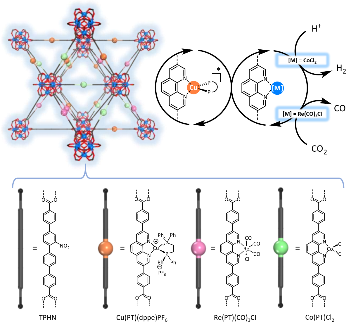 图3 mPTCu/Co和mPT-Cu/Re MOFs的骨架结构及增强了电子转移和光催化活性示意图