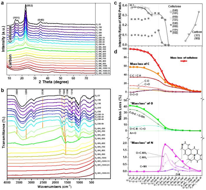 图4. 纤维素在氧–氨联合热解反应制备CP过程中的化学变化