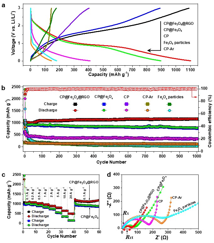图5. CP@Fe3O4@RGO电极及对比样的储锂性能