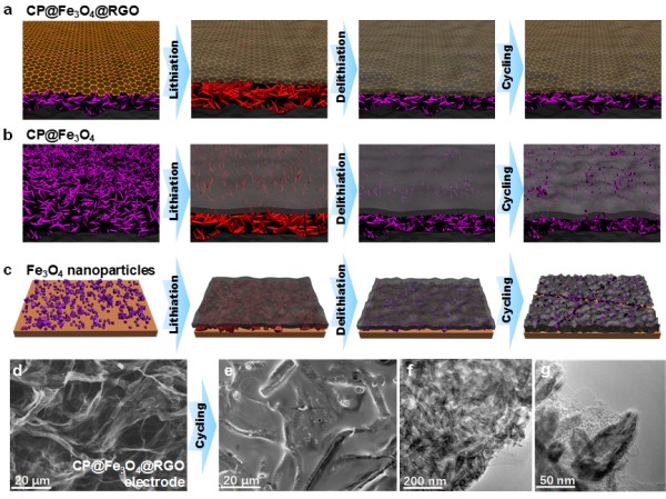 (d-g) CP@Fe3O4@RGO电极在循环前后的表面形貌对比(循环300圈,脱锂状态)。