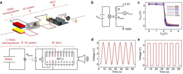 在这项工作中,研究团队提出了一个基于自驱动光通信的通用型任意触觉交互系统(TIS)。作为机械信号采集器的TENG采集来自用户发出的指令,通过LED-光敏电阻构成的光通信器和分压电路,转换成数字信号。单片机可以直接识别数字信号,并针对不同的应用场景运行不同的嵌入式程序。该系统通过光通信解决了HMI系统的核心问题,即将不规则的模拟信号转换成数字信号,而无须使用电容器、电感器和电压比较器等电子元件。基于该TIS触觉交互界面,研究团队还开发了一系列相关应用,展现了TIS广阔的应用前景。以及在即将到来的5G时代和工业4.0时代,TIS可用于更为复杂的交互场景的巨大潜力。