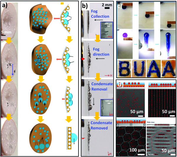 b)在磁场响应性E-LIS上收集雾水。直立状态的微柱适合雾气凝结,弯曲状态的微柱可帮助液滴聚集并从表面滑落。