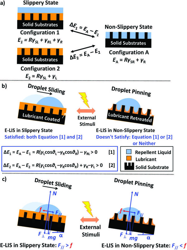 b)E-LIS在滑动态与非滑动态之前切换的示意图。为了保持E-LIS的滑动状态,应同时满足公式1和2。此时,构型A始终处于比构型1和构型2更高的能量状态。另一方面,如果满足方程式1或方程式2的要求,或者不满足任何一项,则E-LIS将转变为非滑动状态。