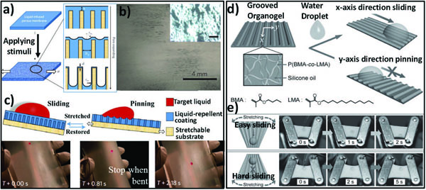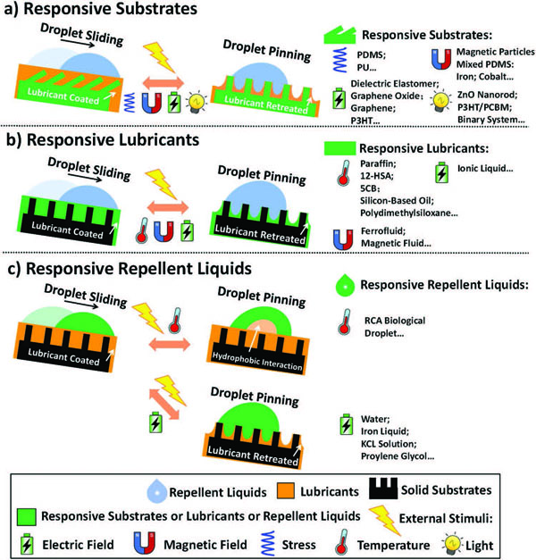 各种外场刺激响应材料作为a)基质、b)润滑剂或c)被斥液体被引入E-LIS。随着基材表面粗糙度和/或化学成分的变化,或润滑剂的相变,润滑剂涂层将覆盖基材表面或退到基材的微/纳结构中。因此,E-LIS的浸润性在滑动态和非滑动态之间切换,被斥液滴分别表现为滑动或钉扎。典型的力响应材料包括弹性PDMS和PU,它们通常被用作响应基底。典型的电场响应材料通常包括电介质弹性体、氧化石墨烯、石墨烯和P3HT作为响应衬底、离子液体作为响应润滑剂、水、铁液、氯化钾溶液和丙二醇作为响应性被斥液体。磁场响应材料包括混合了磁性颗粒的PDMS作为响应性基底,以及铁磁流体和磁性流体作为响应润滑剂。热响应性材料包括石蜡、12-HSA、5CB、硅基油和聚甲基苯基硅氧烷作为响应性润滑剂。RCA生物液滴也被用作热响应被斥液。光响应性材料通常当做基材使用,包括ZnO纳米棒、P3HT/PCBM、二元体系等。