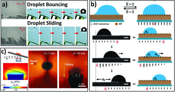 a)在外部磁场作用下,微柱的形状在弯曲和向上之间转变,导致液滴的运动行为在跳跃和滑动之间切换。