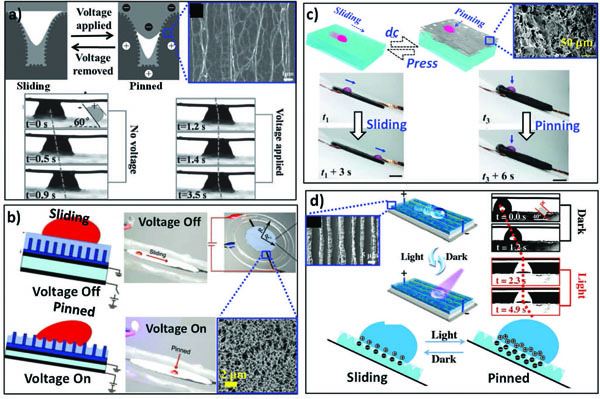 a)当施加和不施加电压时,液滴的浸润状态在Cassie状态(滑动)和Cassie-Wenzel状态(钉扎)之间转换的工作原理。