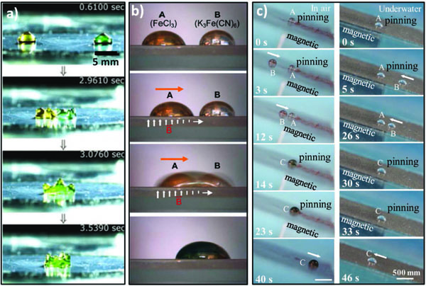 c)磁场响应E-LIS分别显示了可控的用于化学反应的液滴滑动(左)和可控的气泡混合物(右)。对于空气中的液滴,液滴A被固定在磁铁的边缘。液滴B被滴在表面并滑至液滴A,两个液滴混合并固定以进行化学反应(液滴C)。移开磁铁后,液滴C滑落。