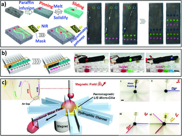 c)在磁性润滑剂灌注的E-LIS上实现液滴可控的运动。