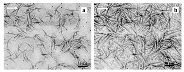 图1. PE取向薄膜135oC退火10分钟后,以5oC/min冷却至(a)117oC 和(b)115oC时光学显微镜观察到的大量叶片状晶体。