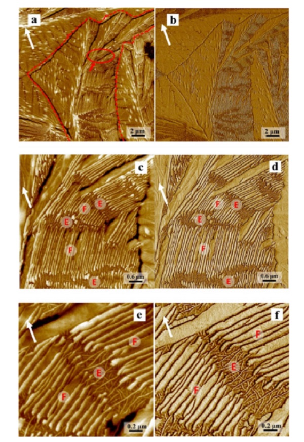 高度取向的PE超薄膜在135oC短时间退火未能转变为各向同性的熔体。因此,重结晶后产生大量的由有序片晶组成的无规取向不对称叶状晶体结构。这些不对称叶状晶体由截然不同于各向同性熔体结晶产生的球晶结构的两部分组成。部分叶片状晶体由平躺片晶组成,这些平躺片晶显示出层状倾斜。然而,平躺片晶的倾斜与环带球晶不同,没有固定的扭曲周期。另一部分叶片状晶体由取向程度较低的侧立片晶组成。提高退火温度或延长退火时间,重结晶后产生常规的球晶结构。这种高度取向的PE超薄膜,从叶状晶体转变为球晶所需的退火时间比最长的本体松弛时间至少长四个数量级。此外,还发现基底性质和薄膜厚度也是影响PE薄膜松弛动力学的重要因素。但是,取向PE薄膜的长松弛时间主要归因于空间受限。将产生球晶所需的退火时间关联为拉伸取向PE链平衡态松弛时间,说明拉伸取向PE超薄膜中的取向分子链具有长期记忆。
