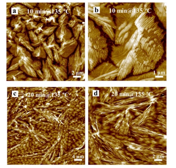 图10. 双层PE薄膜150oC退火10、15和18分钟后以5oC/min冷却至室温的AFM高度图
