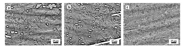 图9. 双层PE薄膜150oC退火10、15和18分钟后以5oC/min冷却至室温的光学显微镜照片