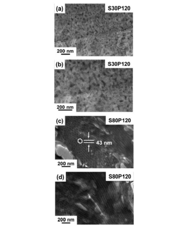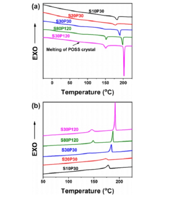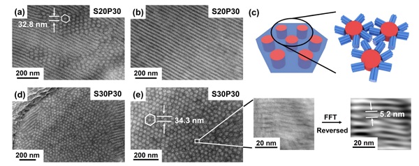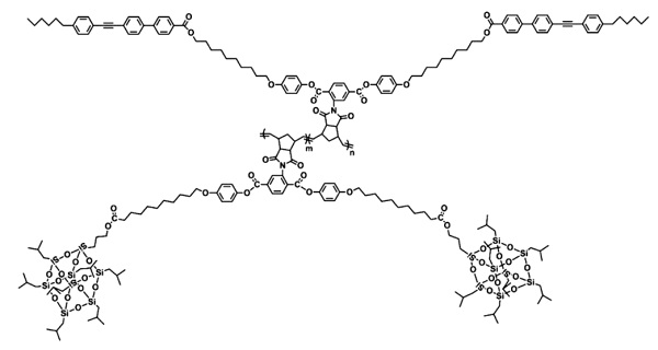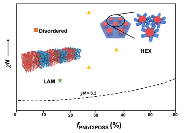 纳米结构单元是具有特定结构和形状的纳米尺寸的分子。它们可以分为一维(1D)棒状分子(如联苯和偶氮苯),二维(2D)盘状分子(如三亚苯基和卟啉)和三维(3D)分子。与BCP不同,纳米结构单元通常在10 nm以下的长度尺度上形成有序结构。因此,在包含纳米结构单元的BCP中,将有不同长度尺度的有序结构。例如,通过BCP和BCP的微相分离,可以获得晶格参数为〜20 nm的HEX相以及d间距值为〜5.5 nm的近晶A(SmA)液晶(LC)相。侧链上的氰基联苯基的自组装。POSS图案也是广泛使用的纳米结构单元之一,因为它对聚合物具有蚀刻选择性,并且在氧等离子体的条件下可以转变为氧化硅。因此,含有POSS图案的BCP吸引了研究人员的兴趣,并被用于纳米多孔膜和纳米图案领域。此类BCP形成大小为10-100 nm的有序微相分离结构,而POSS基序形成的晶体结构的长度约为1 nm。