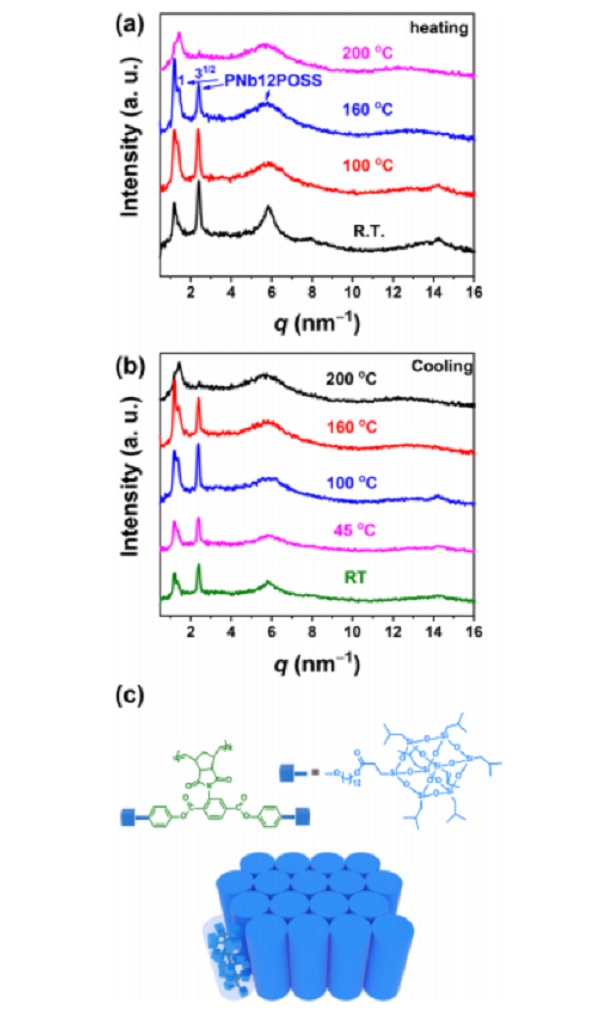 S30P30在加热(a)和冷却(b)过程中的一维WAXD轮廓以及PNb12POSS段的Colh相示意图(c)