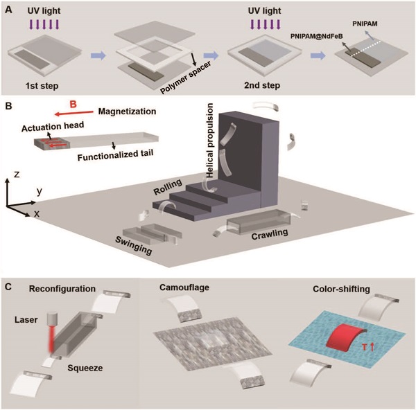 文献链接:Reconfiguration, Camouflage, and Color‐Shifting for Bioinspired Adaptive Hydrogel‐Based Millirobots (Adv. Funct. Mater. 2020, 1909202)。