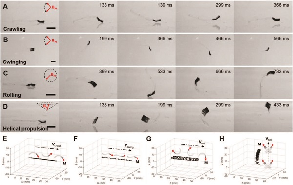 (b)iRobot的磁化和多模态运动(例如爬行,摆动,滚动和螺旋推进)示意图。