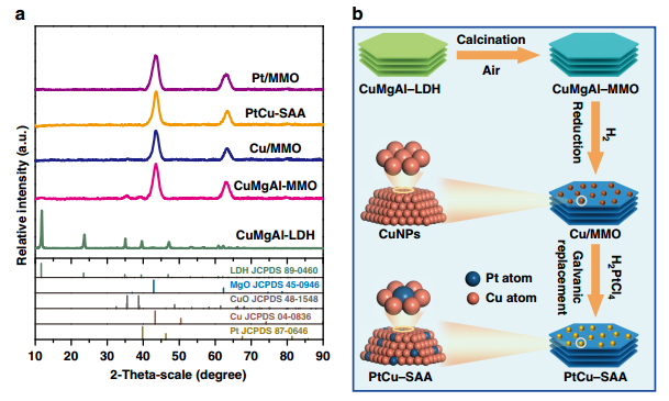 图1. 由LDHs前体合成PtCu-SAA并进行表征