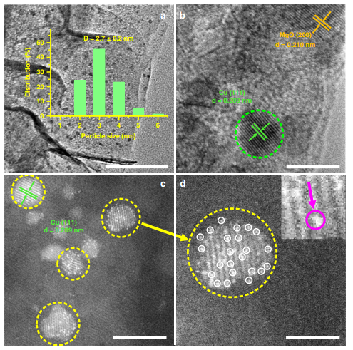 PtCu-SAA的 (a) TEM图像、(b) HRTEM图像、(c) AC-HAADF-STEM图像及(d) 相应的放大图。