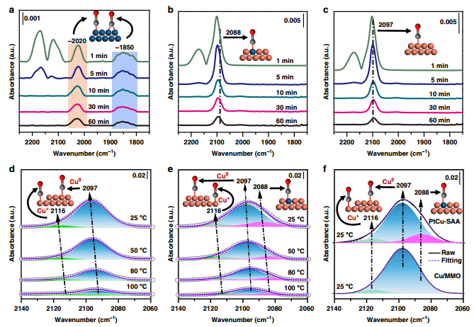 (a-c) Pt/MMO、PtCu-SAA、Cu/MMO随时间变化的原位CO-DRIFTS谱;(d-e) Cu/MMO和PtCu SAA 随温度变化的CO-DRIFTS高斯拟合谱;(f) Cu/MMO和PtCu-SAA在25℃的原位CO-DRIFTS谱。
